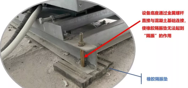 如上圖所示,設(shè)備底座通過金屬螺桿穿過直接與混凝土基礎(chǔ)、或金屬框架連接固定,那設(shè)備運(yùn)行的振動可通過金屬螺桿這個“硬連接”傳導(dǎo)至建筑結(jié)構(gòu),隔離在設(shè)備與建筑結(jié)構(gòu)之間的橡膠減振墊如同“虛設(shè)”,發(fā)揮不了減振的作用。