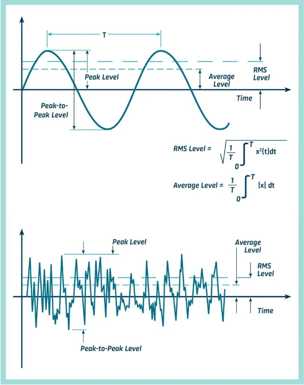 振動幅度是描述振動嚴(yán)重程度的特征,可以以幾種方式量化。圖中顯示了正弦波的峰峰值、峰值、平均值和RMS值之間的關(guān)系。