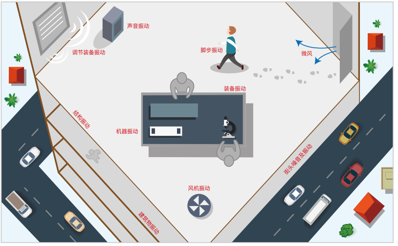振動是指在基準(zhǔn)位置上產(chǎn)生的機(jī)械式搖動,也就是說,構(gòu)造物或地板等受動態(tài)外力之后,隨著時(shí)間推 移,開始從運(yùn)動平衡位置產(chǎn)生重復(fù)運(yùn)動的現(xiàn)象。在各種振動中,地基振動是我們能夠感覺到的較重振動,但也有很多我們在日常生活中難以感知的微細(xì)振動,這種微細(xì)振動會給半導(dǎo)體工程設(shè)備、 電子顯微鏡、精密測量器、 光學(xué)及光學(xué)相關(guān)機(jī)器之類對振動敏感的超精密設(shè)備性能帶來影響。