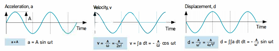 振動一般可通過位移、 速度和加速度來表示,此時(shí)振動的形狀和周期無論用位移、 速度、 加速度中任何一個(gè)來表示均是相同的,但差異在千存在位相差。 就正弦波信號而言,位移、 速度及加速度增幅與時(shí)間函數(shù)有著數(shù)學(xué)上的相關(guān)關(guān)系。 如不考慮位相,速度則由與頻率成比例的任意常數(shù)除以加速度來計(jì)算得出,位移則以與頻率自乘成比例的任意常數(shù)除以加速度來計(jì)算得出。